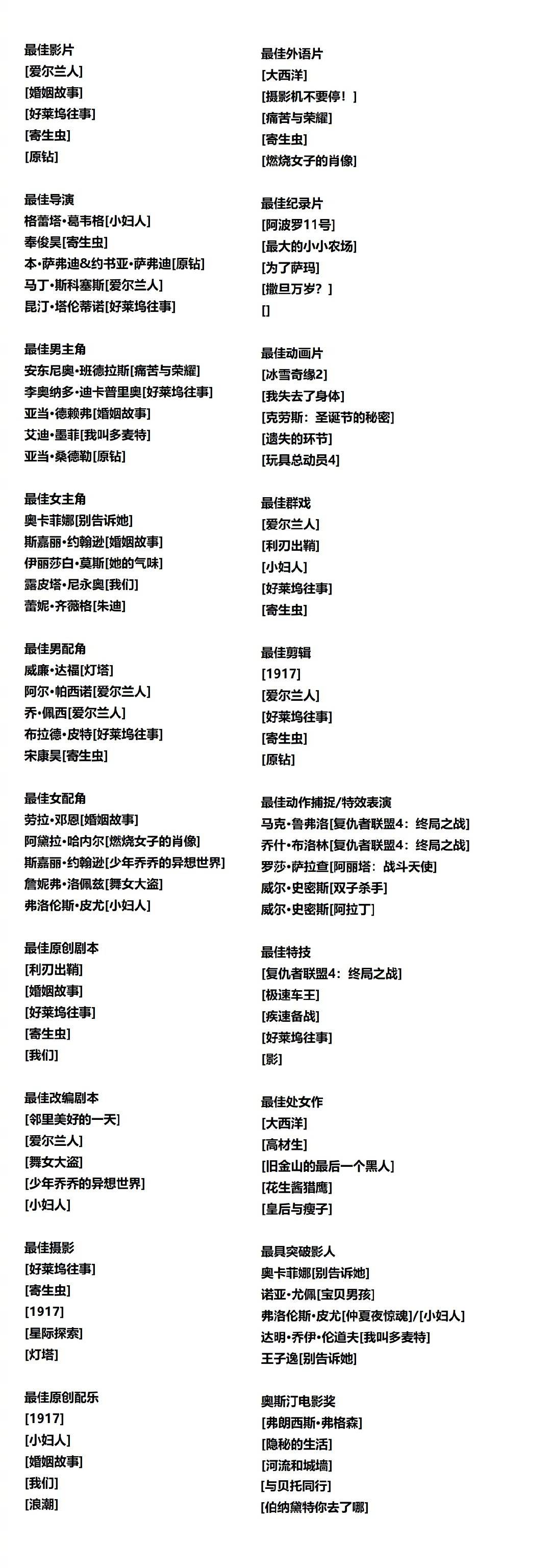 1月1日,第16届奥斯汀影评人协会奖公布完整提名名单。《好莱坞往事》以9项提名领跑,《寄生虫》紧随其后,获8项提名。这两部影片与《爱尔兰人》、《婚姻故事》和《原钻》共同提名最佳影片。获奖名单将于1月6日的奥斯汀电影奖颁奖仪式上宣布。