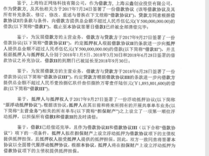 根据浮动抵押协议,为了发展单车主营业务,上海钧正曾于2017年7月、2017年9月与上海云鑫签署了两份借款协议,其中,第一份借款协议的5亿元已经全部清偿完毕,而第二笔借款同样作价5亿。