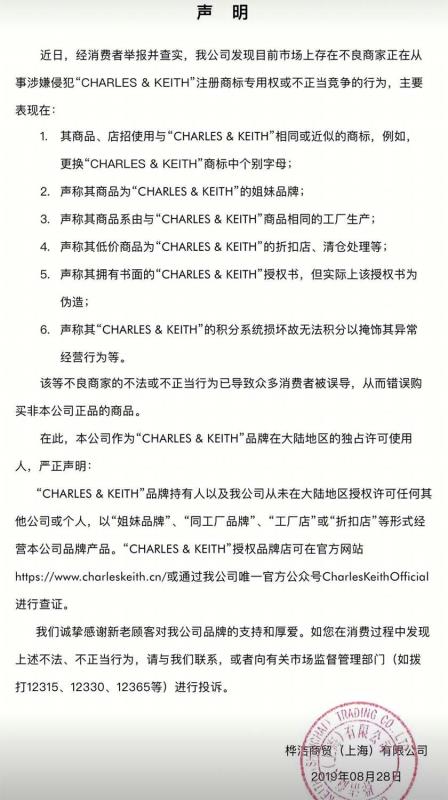 目前,CHARLES & KEITH采取的应对方式是通过官方微博发出声明,据CHARLES & KEITH相关负责人介绍,正在请求国家知识产权局商标局裁定撤销涉嫌侵犯“CHARLES & KEITH”的注册商标。