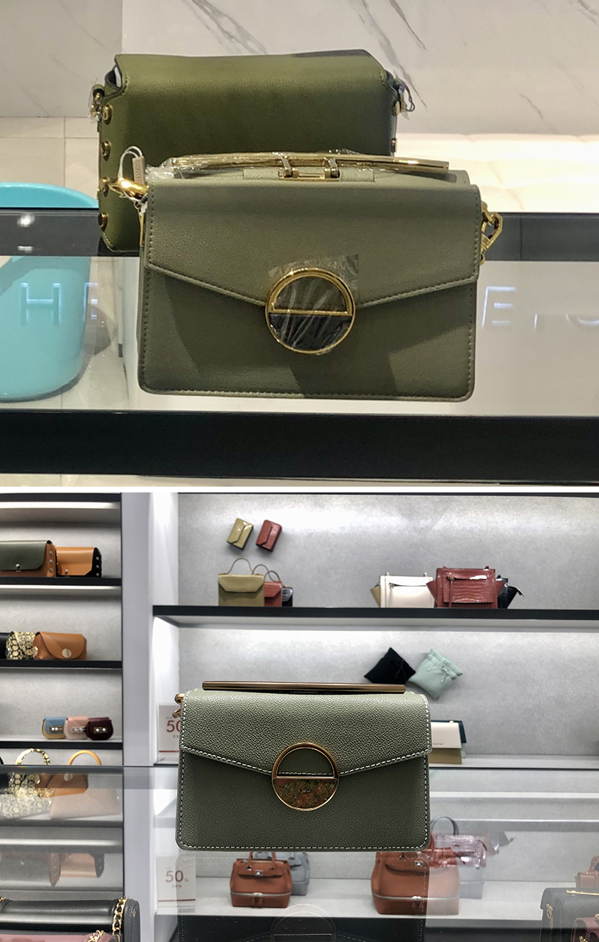 据界面重庆观察,富安百货二楼这家店内百分之九十以上的包袋与“小CK”款式雷同,其中不乏有今年大火的漆皮腰包、蛇皮纹圆环手拿包、流苏信封包等,还有一部分包袋则与Coach、GUCCI等大牌包袋款式“撞脸”。