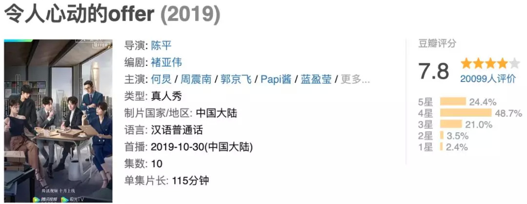 仅从这一维度来看,7.8分、四星占比最大的《令人心动的offer》还是有一定的遗憾。这或许依然是引进版权综艺在保持原版内核与本土化之间平衡的难题。