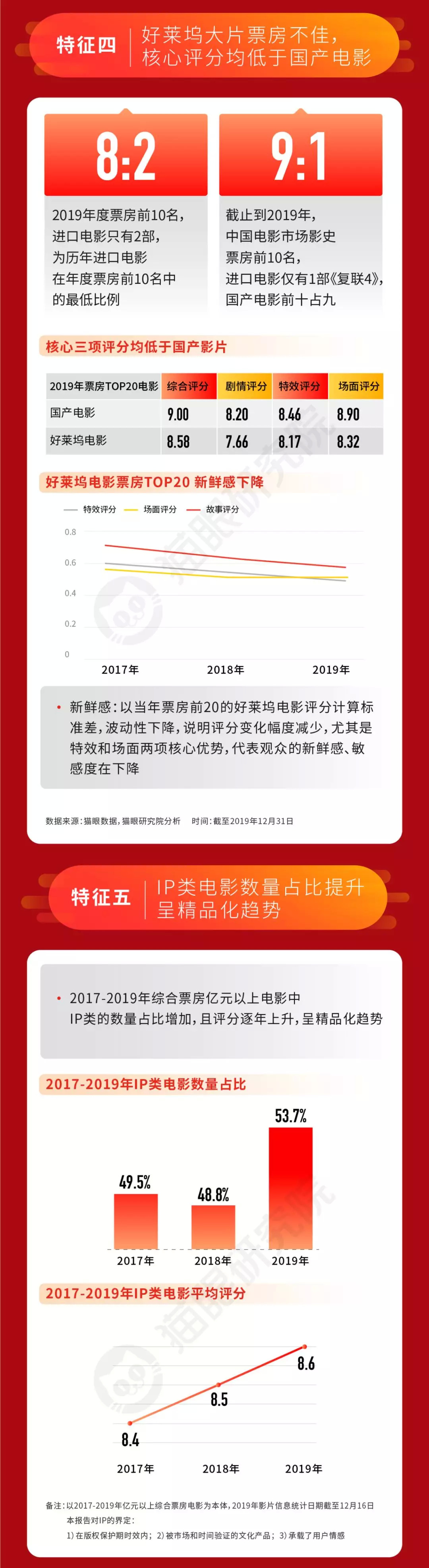 这和国产电影的影片质量提升有很大关系。《2019年中国电影市场数据洞察》显示2019年年度TOP20电影的综合评分、剧情评分、特效评分和场面评分的四个核心指标上,国产电影均优于好莱坞电影。