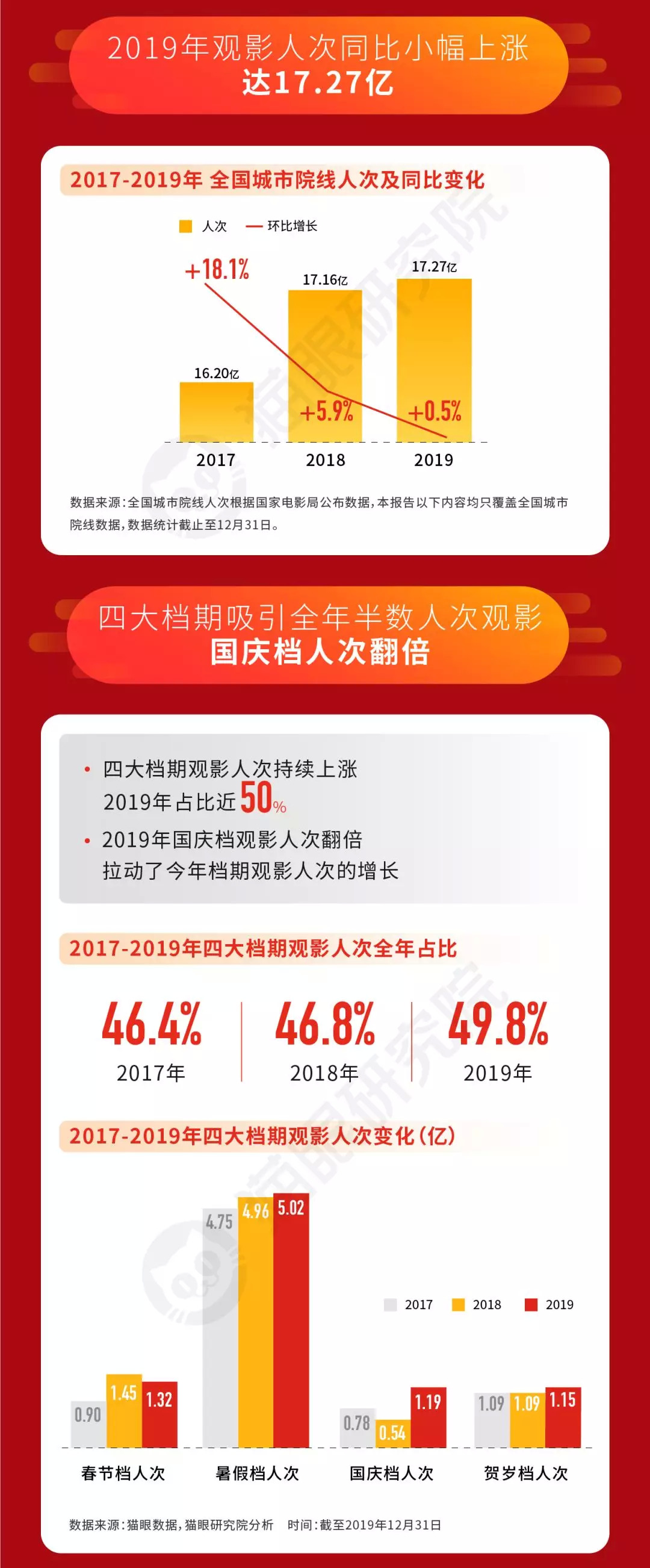 另一个层面是中国电影档期现象非常明显。数据显示春节档、暑期档、国庆档和贺岁档已经成为观众观影的主要选择,在2019年吸引了8.68亿人次走进电影院,占全年观影人次17.27亿的49.8%,占比相比较于2018年提升了3个百分点。