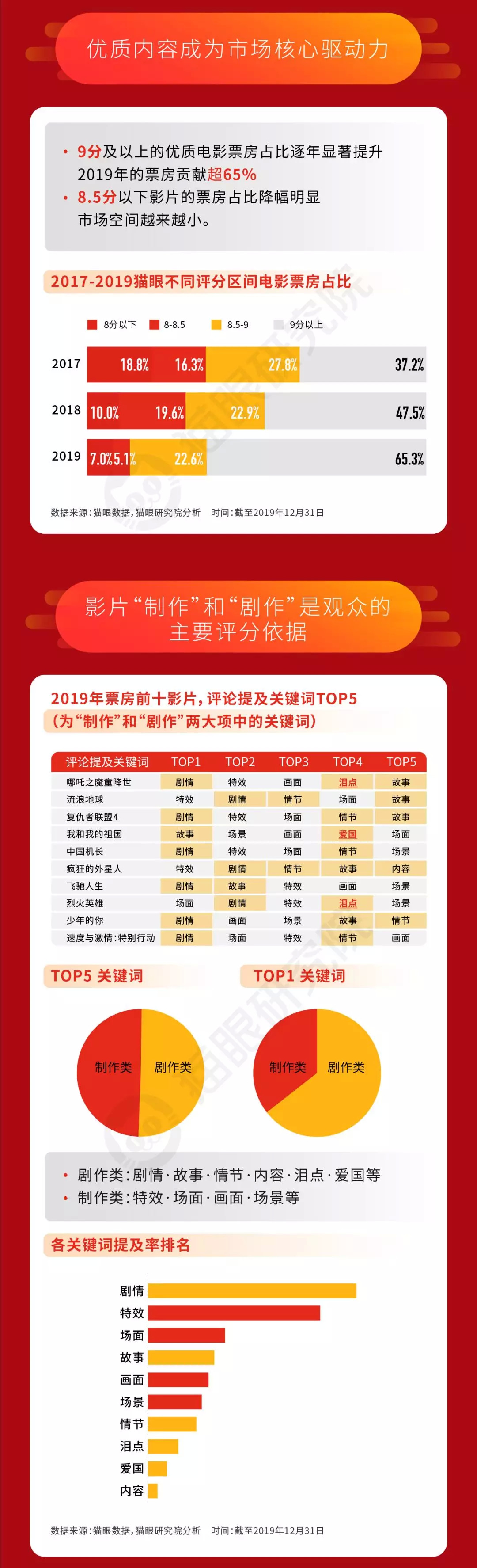 这种变化背后是中国观众更加成熟,对于中国故事的理解力更强。在2019年观众的评论关键词上,剧情成为观众对一部电影评价最重要的指标,因此植根于中国文化的国产电影故事,更容易引起观众的共鸣。