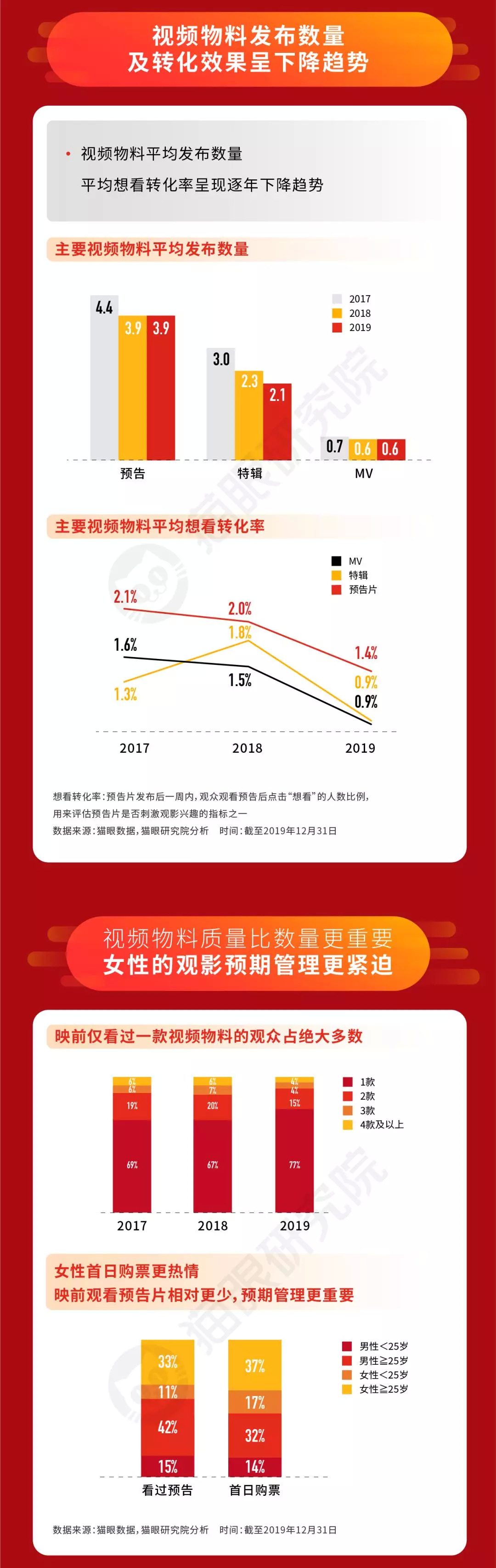 《2019年中国电影市场数据洞察》显示2019年影片营销在映前3周、映前2周和映前1周映前热度明显低于2017年和2018年;视频物料的发布数量和转化效果呈现下降趋势,其中2019年预告片平均想看转化率为1.4%,相比较于2018年的2%降幅明显,而MV的转化率为0.9%,相比较于2018年的1.5%亦降幅明显。