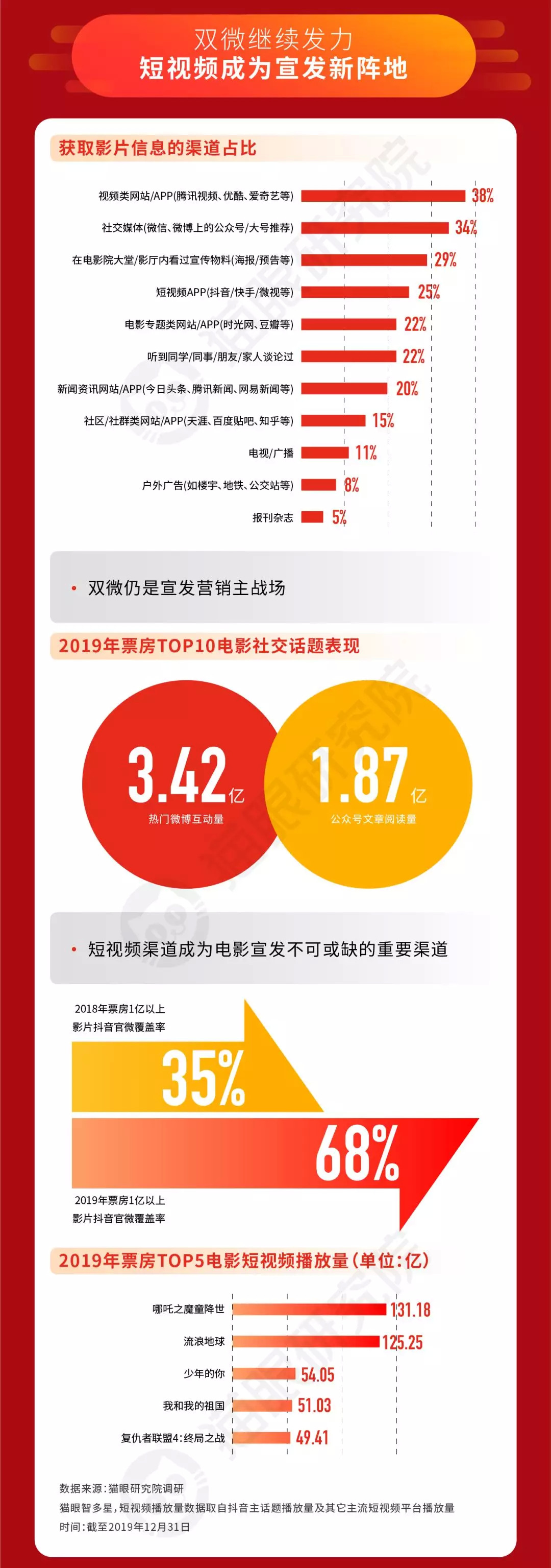 数据显示,票房亿元以上的影片抖音官微覆盖率2018年的35%迅速提升至2019年68%,可见短视频宣发渠道的重要性日益凸显;2019年票房TOP5电影短视频的播放量已经突破百亿次,最高的《哪吒》达到131.18亿次,与影片的票房呈正相关性。