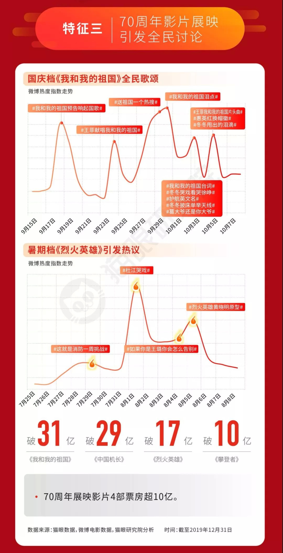 其中《我和我的祖国》在传播的各个节点都引来全民关注,#我和我的祖国预告响起国歌##送祖国一个热搜##我和我的祖国泪点#等微博话题持续创造微博热度指数新高;《烈火英雄》中的话题#这就是消防一周体验##杜江哭戏#等也引来全民热议。