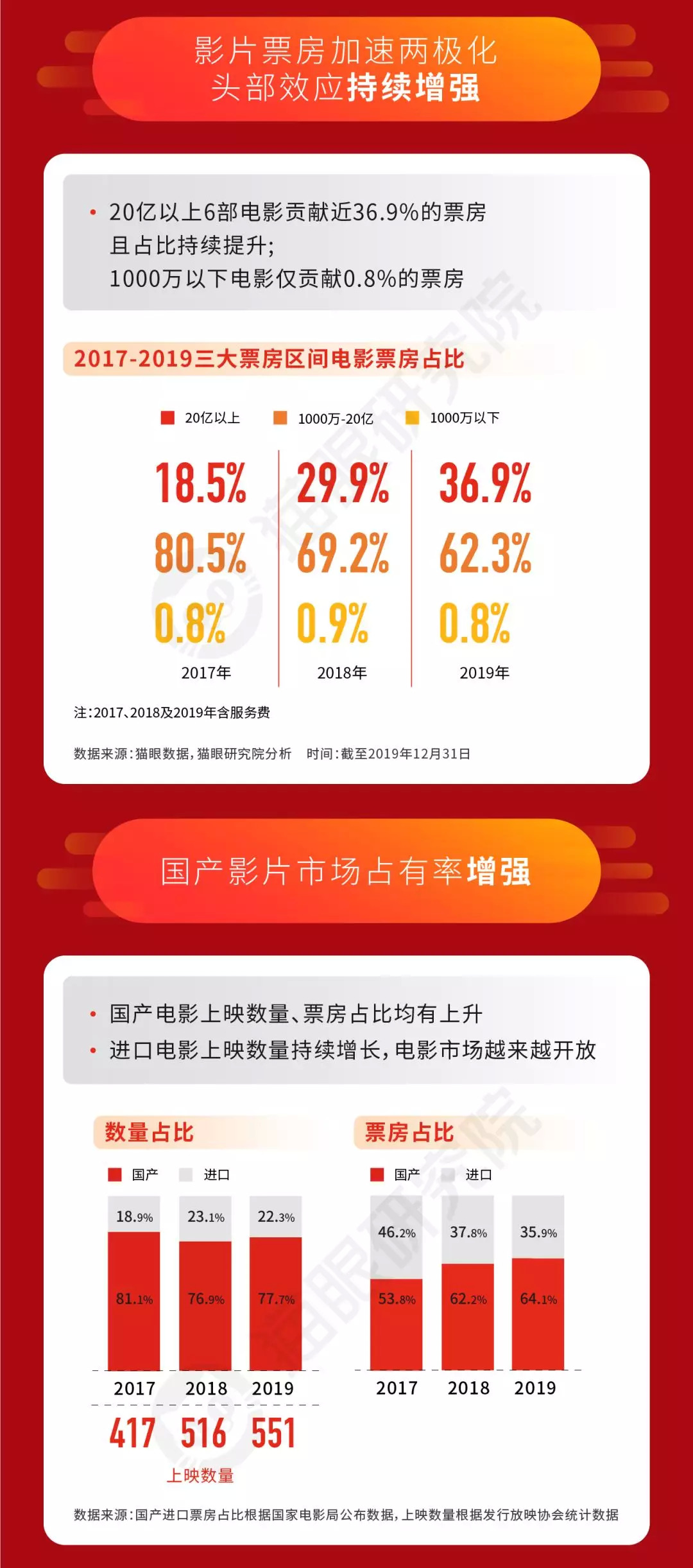 这可以从两方面去理解,一是少数TOP级别的电影获得了非常可观的回报,占据市场的主要份额,而更多的腰尾部电影没有享受到票房增长的红利。根据猫眼的《2019年中国电影市场数据洞察》显示,20亿以上的6部电影贡献了近36.9%的票房;而1000万以下的电影仅供献0.8%的票房,两极分化非常严重。