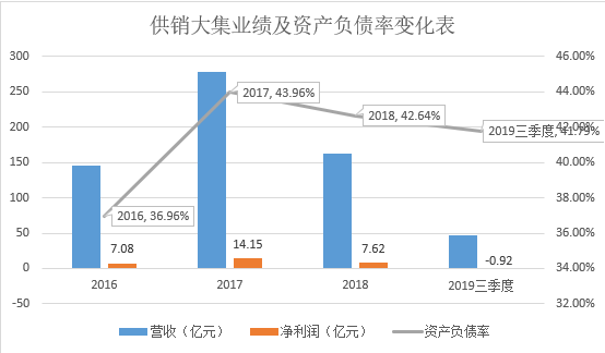 业绩方面,2019年前三季度,供销大集实现营业收入47.35亿元,同比暴跌66.56%;净利润-9152.59万元,同比暴跌111.93%。