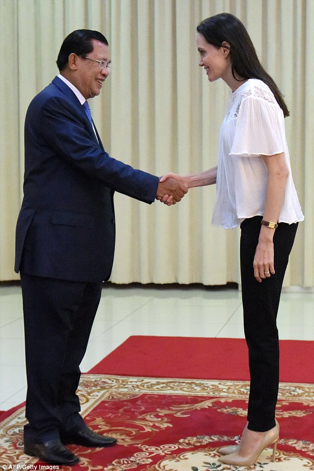 这位40岁的顶级女星于周四早上在柬埔寨首都金边的和平宫会见了首相洪森,在正式会晤开始之前,她礼貌地跟洪森握了握手。