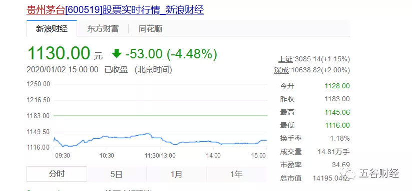 截止2020年1月2日收盘,贵州茅台股价为1130元/股,跌幅在4.48%左右,资本短期信心不足。