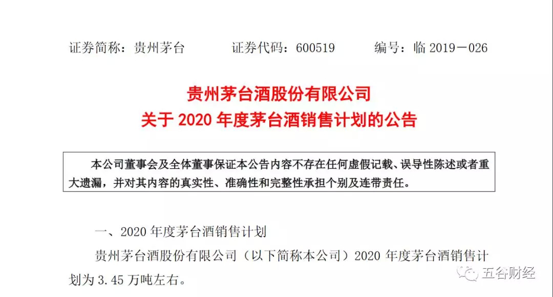 2019年12月27日,贵州茅台还发布了《关于2020年度茅台酒销售计划的公告》,2020年度茅台酒销售计划为3.45万吨左右。