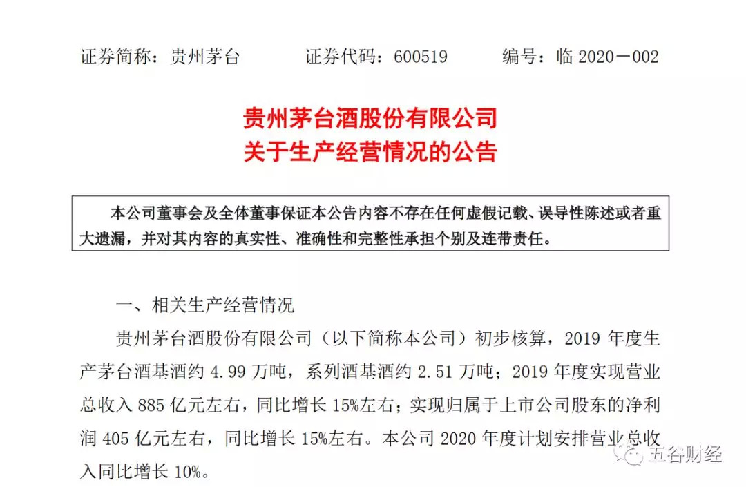 贵州茅台方面在公告中表示,初步核算,2019年度生产茅台酒基酒约4.99万吨,系列酒基酒约2.51万吨;2019年度实现营业总收入885亿元左右,同比增长15%左右;实现归属于上市公司股东的净利润405亿元左右,同比增长15%左右。
