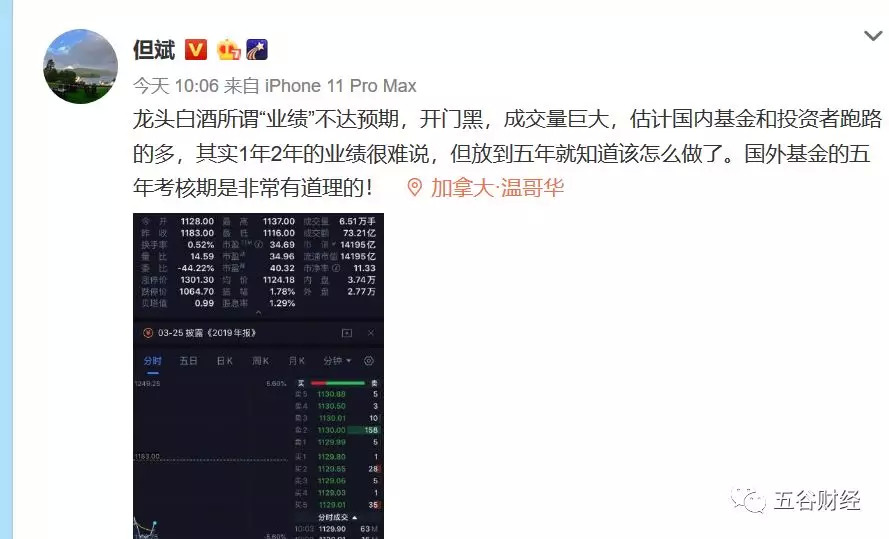 但斌也在个人微博上表示,龙头白酒所谓“业绩”不达预期,开门黑,成交量巨大,估计国内基金和投资者跑路的多,其实1年2年的业绩很难说,但放到五年就知道该怎么做了;国外基金的五年考核期是非常有道理的!