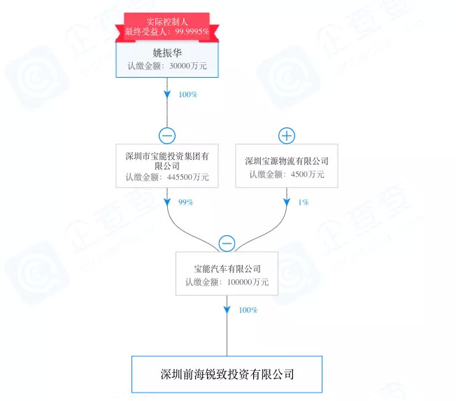 企查查信息显示,前海锐致为宝能汽车有限公司100%控股子公司,实际控制人为姚振华。
