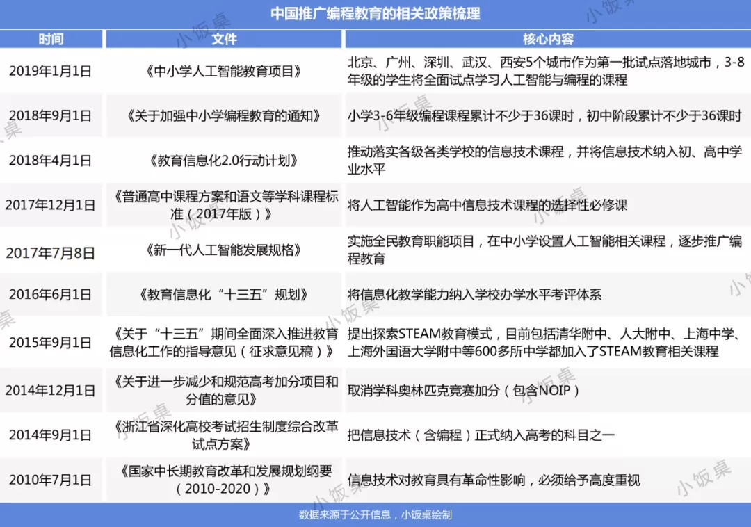 真正让少儿编程走入寻常百姓家以及成为基础学科教育的是国家不间断推行的政策。其中尤以国务院印发的《新一代人工智能发展规划》功劳最大,规划中提到的“在中小学阶段设置人工智能相关课程,逐步推广编程教育”让公立学校的编程教育开始提上日程。