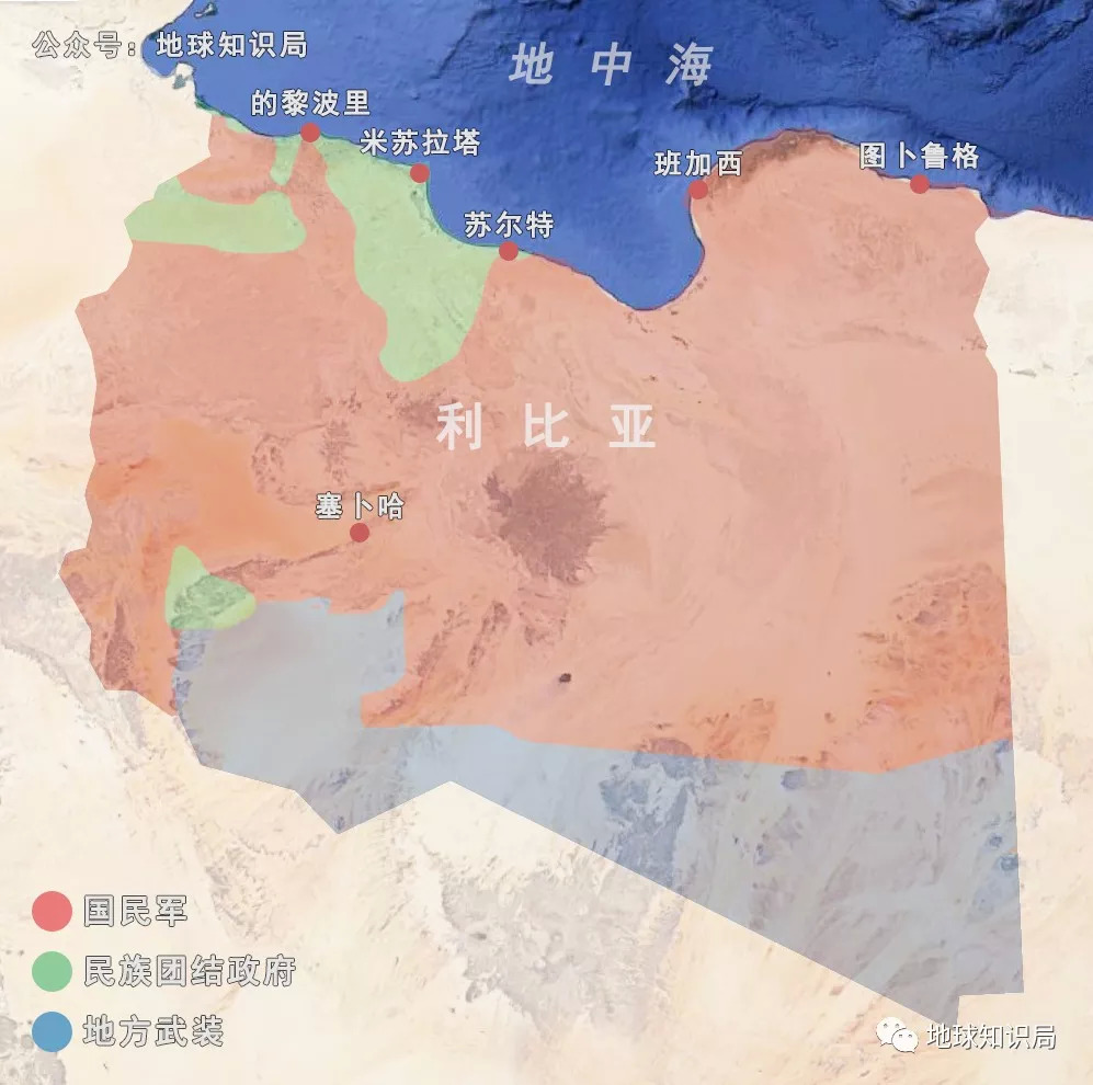 而东部的利比亚国民代表大会和利比亚国民军,则是当时受法国支持的推翻卡扎菲的原班人马,背后有法国、俄罗斯、埃及、沙特等国的支持。