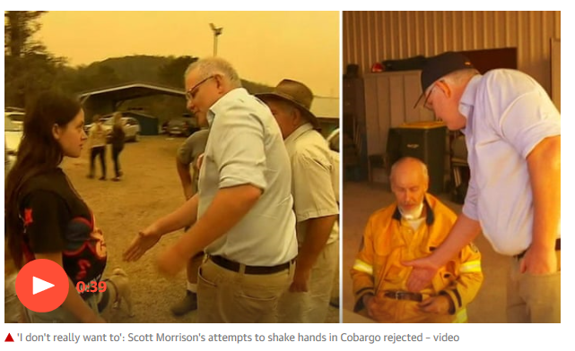 在澳大利亚国家电视台(ABC)拍摄的一段视频中,一名当地居民怒视莫里森,称只有RFS得到更多联邦资助时她才愿意和他握手。而另一名白发稀疏的消防员则看都不想看他一眼,直接起身离开。