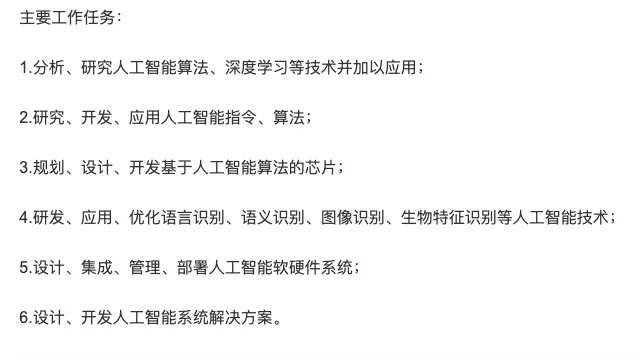 随着人工智能技术对大众生活产生的影响越来越深刻,在人社部去年发布的新职业名单中,都会有与人工智能领域的相关细分职业出现。比如,在 2019 年 1 月公示的一批新职业中,「人工智能工程技术人员」赫然在列。当时,这门职业被定义为「从事与人工智能相关算法、深度学习等多种技术的分析、研究、开发,并对人工智能系统进行设计、优化、运维、管理和应用的工程技术人员」。