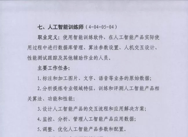 近日,中国就业培训技术指导中心发布了《关于拟发布新职业信息公示的通告》,经人社部同意,拟发布的 16 个新职业已进入公示阶段,其中就包括一项名为「人工智能训练师」的职业。