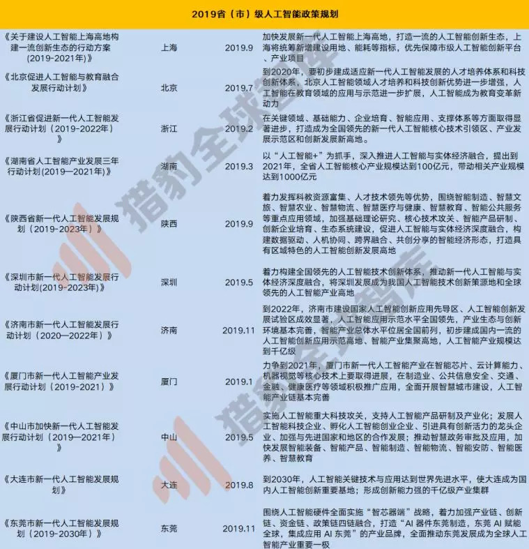 承接2018年,2019年包括上海、浙江、湖南、陕西等省市,深圳、厦门、济南、苏州、东莞等市纷纷发布方向性的“人工智能发展行动规划”。北京则更为具体,出台与教育融合的行动规划。这意味着,政策对于人工智能发展的指引不仅向下渗透,更开始聚焦于具体场景和产业的指导性规划。而这些规划背后,除了人工智能与经济社会融合程度更高,也意味着更多有关产业升级的商业机遇出现。