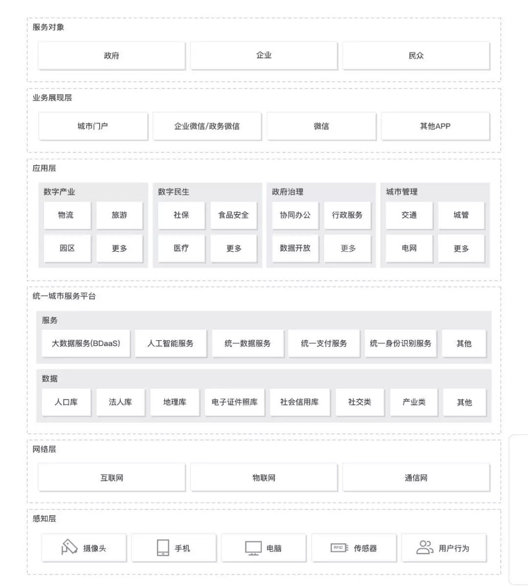 依据国家标准《GB/T 34678-2017智慧城市 技术参考模型》,由艾瑞咨询研究院整理的“中国智慧城市一般技术架构”可以大概了解智慧城市的基本要素。