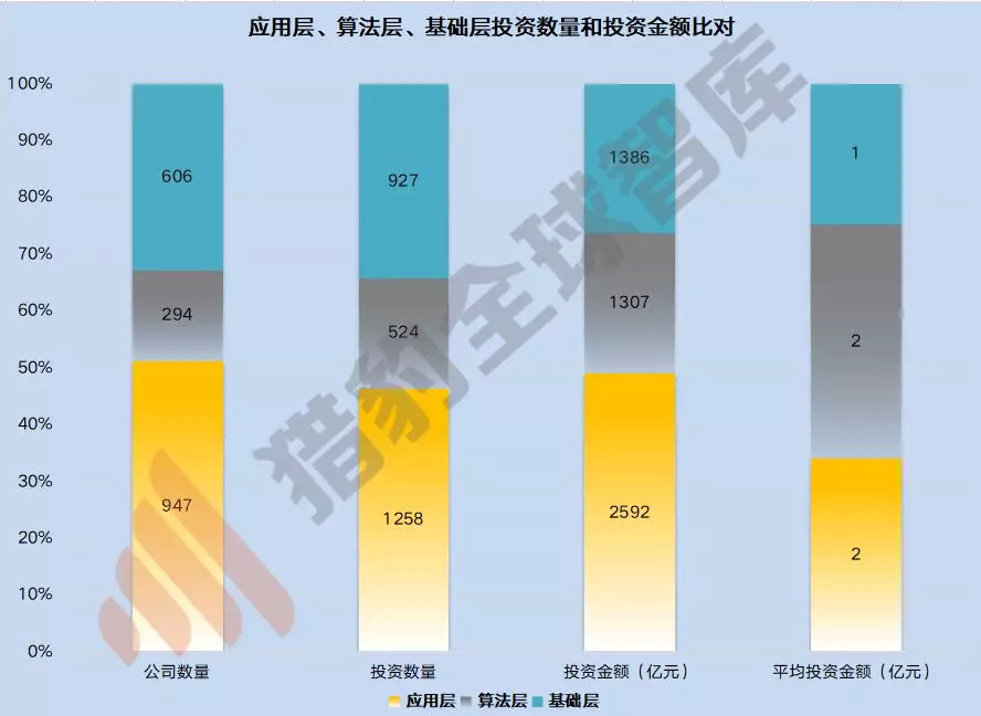 和一些研究认为资本大多集中在平台层不一样,猎豹全球智库发现,人工智能行业产生最多融资数量和金额的依旧为应用层,从2012年以来,应用层融资金额达到了2592亿,投资数量为1258次,这说明目前的人工智能投资更加倾向于能够实现较快速度变现的项目。