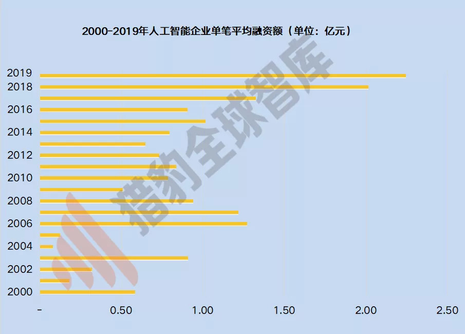 猎豹全球智库统计分析,自2000年以来,人工智能企业的融资数量已持续18年上涨,在2013年至2018年出现大爆发,融资金额和数量直线飙升,且2014年后这一数据还以接近50%的幅度在增长。