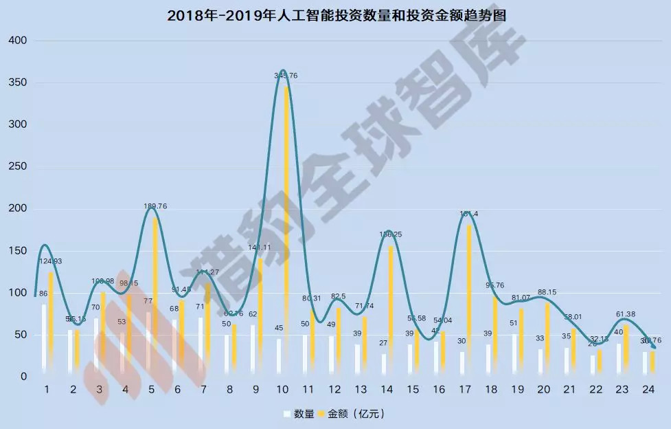 通过IT桔子数据发现,2019年人工智能企业的融资额从5月开始,几乎呈现出逐步下滑的态势,而在2018年这一情况还是一片蒸蒸日上,并在2018年的10月份融资金额达到了345.76亿的全年之最。