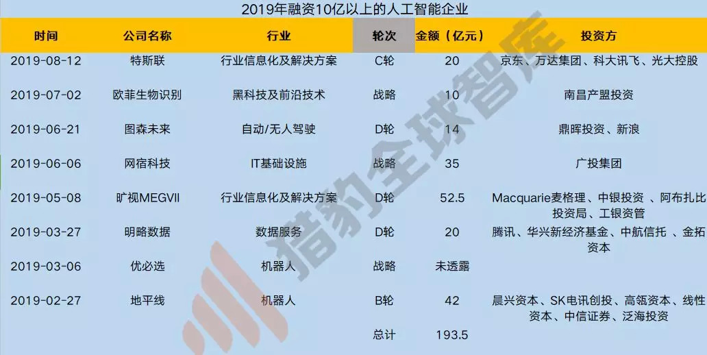 从2018年和2019年10亿以上融资的案例来看,行业解决方案也是融资的主力,其中包括旷视科技、商汤科技、优必选等行业解决方案企业均是人工智能行业的融资大户。