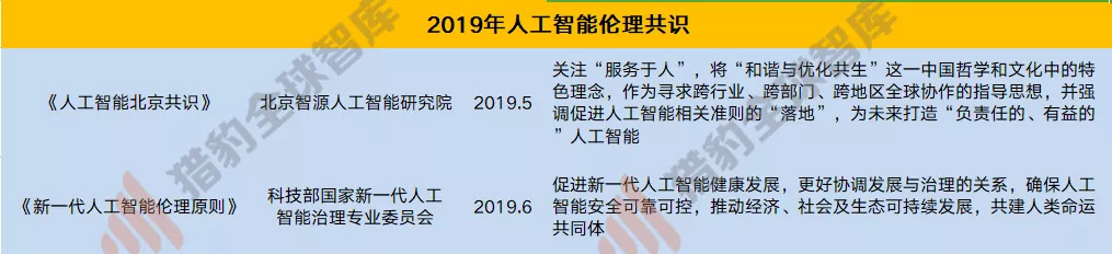 对人工智能伦理的关注并不属于政策层,但与引导行业发展有关。2019年,两个有政府背景的机构分别发布《人工智能北京共识》(北京智源人工智能研究院)和《新一代人工智能伦理原则》(国家新一代人工智能治理专业委员会),聚焦人工智能健康发展相关准则,确保其安全可靠可控。