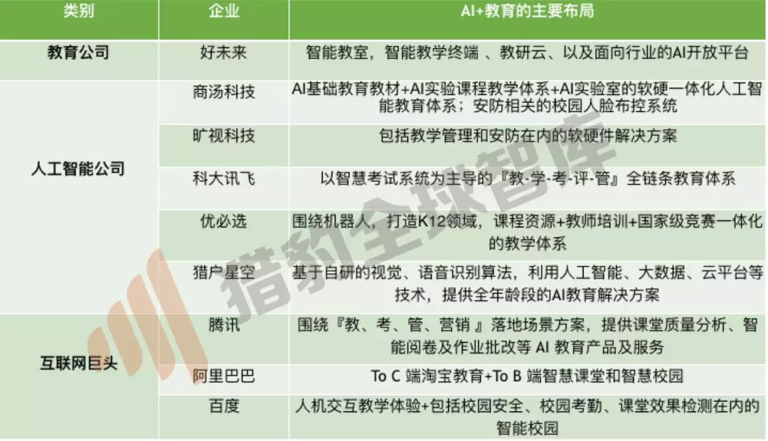猎豹全球智库曾根据教育部发布的政策与投入经费预估,我国在教育信息化的投入将达到3600亿。政策、技术发展、市场规模等都为人工智能和教育的结合提供了条件。可以看到,2019 年不论是在线教育公司,人工智能企业,互联网巨头,都纷纷布局 AI+ 教育。