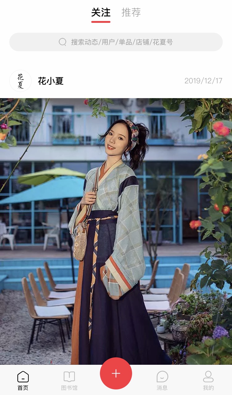 花夏APP的开机界面显示“记录汉服生活”。进入首页后,界面时尚看到,首页可以在“关注”和“推荐”两个菜单页之间切换,这部分主要承担社交功能和算法呈现。