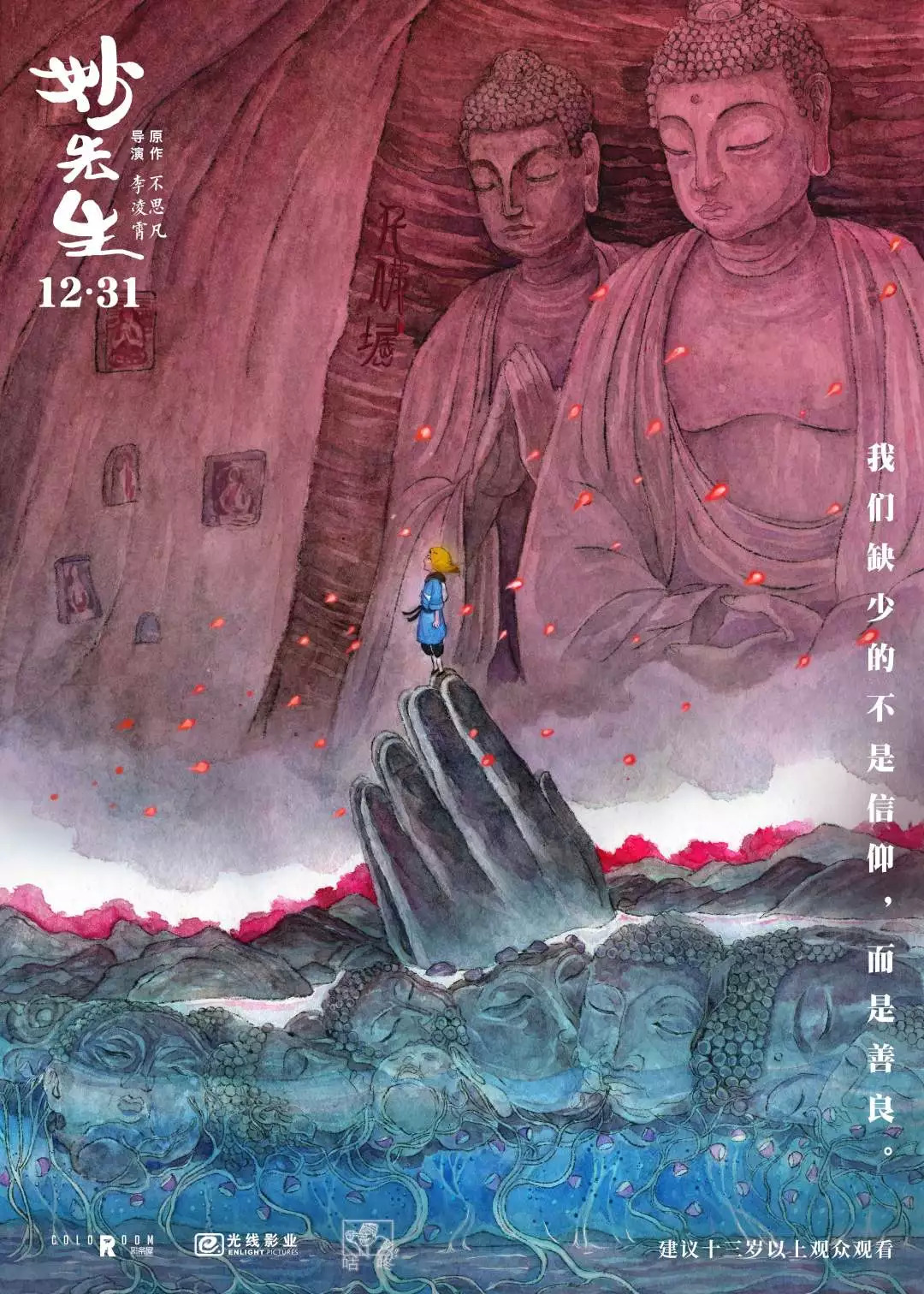 第二张海报更具现实性,破败的大佛象征着“信仰的逐渐坍塌”,独行的男主代表每一个身在时代中的人们。结合当下社会,逐名逐利日渐成为主流,更有甚者为利益不顾一切代价。“在信仰缺失的时代,你还会守护善良吗”,这也是影片想让观众一起思考的问题。