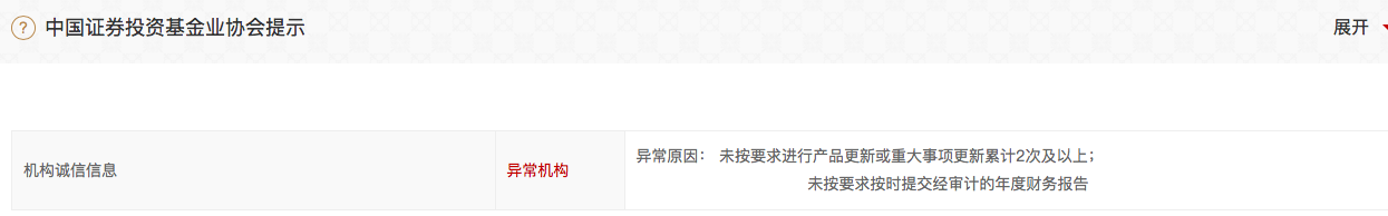 中基协显示,神凯投资2013年成立,2015年登记为私募基金管理人,旗下成立6只基金;且因未按要求进行产品更新或重大事项更新累计2次及以上、未按要求按时提交经审计的年度财务报告被中基协列为异常机构,最后更新时间为18年7月。