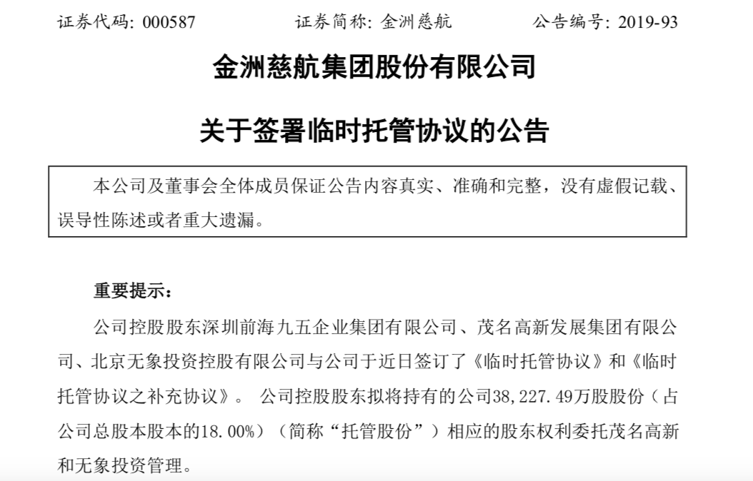 19年12月31日,金洲慈航披露,控股股东九五集团拟将所持18%股份相应股东权利委托茂名高新和无象投资管理,权益变动后,九五集团仍持有金洲慈航表决权总股数为约.04亿股(占公司总股本的19.04%),实际控制人未发生变化、为朱要文。