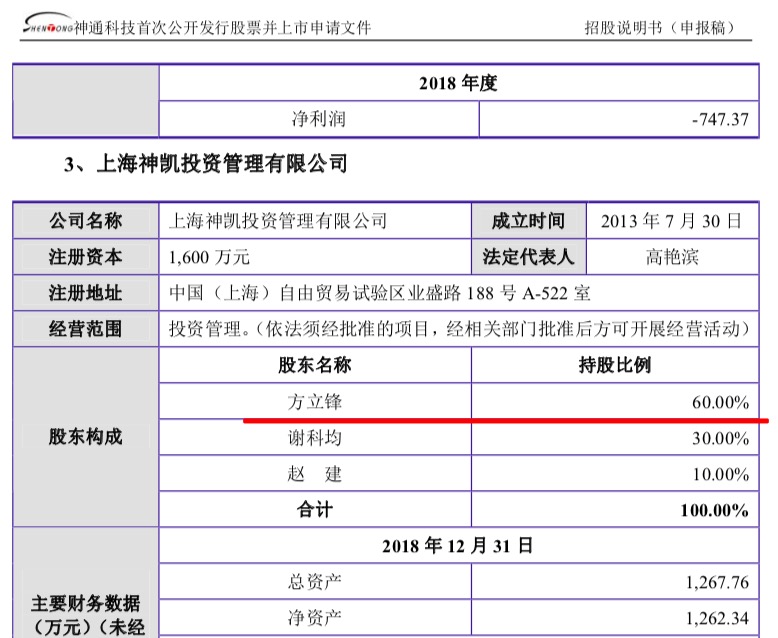 神凯投资控股股东方立锋是神通科技法人。神通科技于19年5月向证监会递交招股书,计划赴上交所IPO,保荐机构为广发证券。据招股书,神凯投资正是神通科技实际控制人控制的企业。