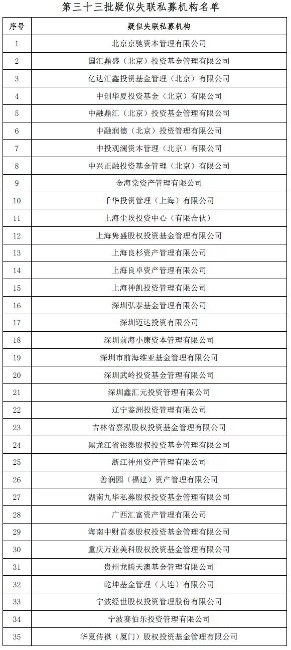 35家新增疑似失联私募基金管理人中还包括被立案调查的P2P魔房宝创始人的尘埃投资、弘康人寿保险法人卢德之参股的深圳武岭投资基金管理有限公司,新三板企业九州量子关联的浙江神州资产管理有限公司等。第三十三批疑似失联私募机构名单: