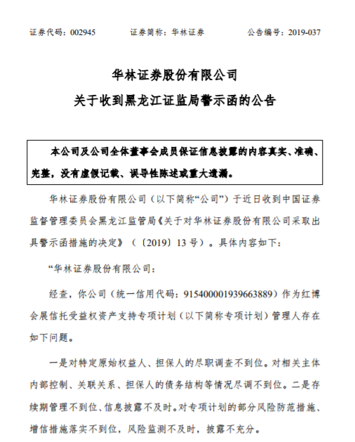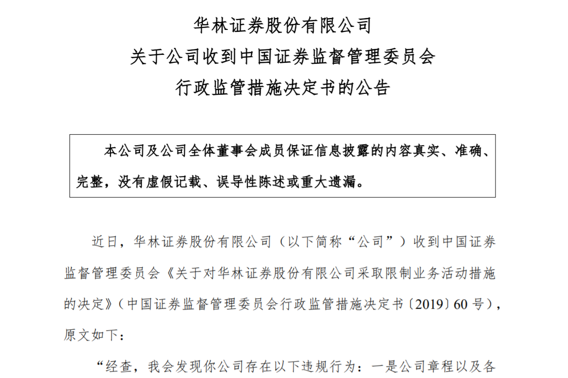 而此次也并非华林证券第一次因合规风控问题收到罚单。2019年5月19日,在华林证券上市刚满4个月的时候,公司就曾收到来自黑龙江证监局的警示函。