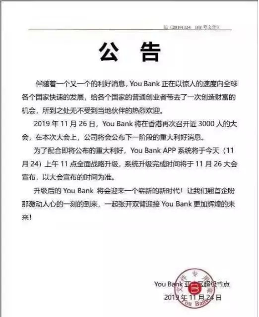 YouBank是2019年最火爆的资金盘项目之一,号称有800万投资者。2019年11月24日,YouBank关闭充提,引起投资者恐慌。