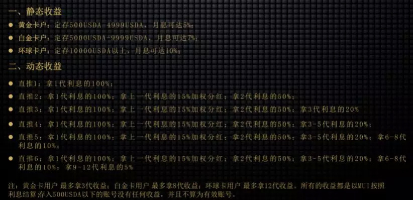 其中,投资500-4999美元的黄金卡用户,最多拿3代收益;投资5000-9999美元的白金卡用户,最多拿8代收益;投资10000美元以上的环球卡用户,最多拿12代收益。