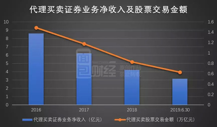 财达证券的证券经纪业务主要以代理买卖证券业务为主。截止2019年6月末,公司的股票交易量及代理买卖证券业务净收入均呈下降状态,这也是经纪业务营收及占比下降的原因之一。