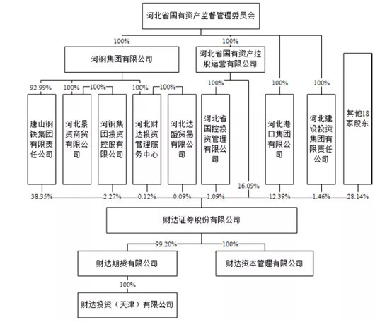 财达证券是由财达有限以整体变更方式设立的股份有限公司。截止此次招股说明书签署日,财达证券的实控人为河北省国资委,间接持有公司71.86%的股权。唐钢集团为公司的控股股东,持有公司10.53亿股,占本次发行前总股本的38.35%。