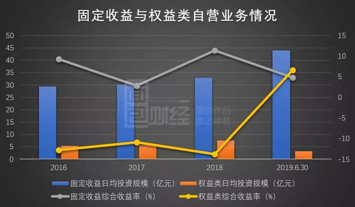 截至2019年6月末,公司固定收益类自营投资日均规模达43.98亿元,较上年末增加11.09亿元,但综合收益率却由上年度的11.42%降至4.84%。权益类自营日均规模为3.2亿元,较上年度下降超4亿元,但综合收益率达6.64%。