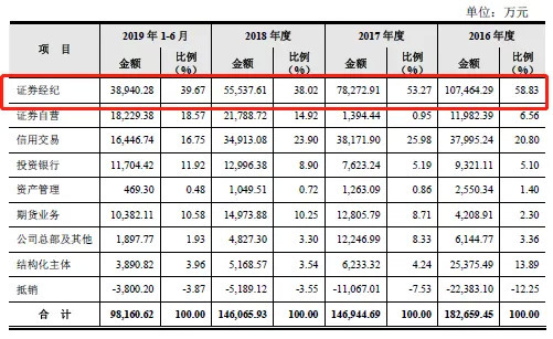 申报稿显示,证券经纪业务是财达证券重要的收入来源之一,也是公司创新业务发展的保障。虽然近年来公司不断拓展其他业务领域,但预计未来一段时期证券经纪业务仍将是本公司主要的收入来源。然而截至2019年6月末,公司证券经纪业务营收为3.89亿元,在总营收中占比不到40%,远不及2016年的占比。