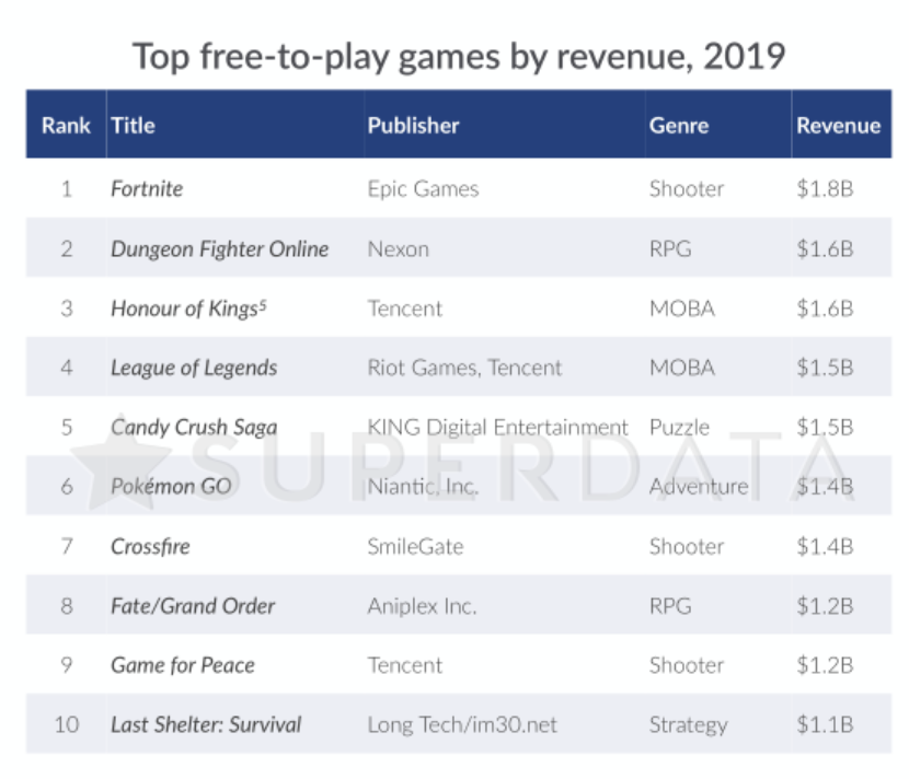 作为营收最高的游戏公司,腾讯的《王者荣耀》收入跌24%,至16亿美元;《英雄联盟》则升7.1%,至15亿美元;至于去年五月推出的手游《和平精英》(绝地求生手游版)收入有12亿美元,排第九。SuperData预计今年免费游戏可增长约1.8%,至887亿美元。值得一提的是,《堡垒之夜》开发公司Epic也是由腾讯参股。