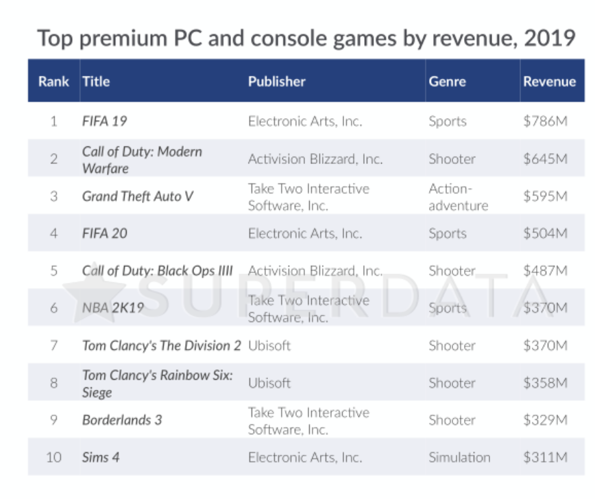 由于游戏主机即将进入下一个更新周期,以《使命召唤》《荒野大镖客》为代表的PC、主机大制作游戏面对的是一个寡淡的2019,收入同比下跌5%至189亿美元。营收最高的大制作游戏是EA的《FIFA19》,达到7.96亿美元,其次是《使命召唤:现代战争》和《侠盗猎车手5》。