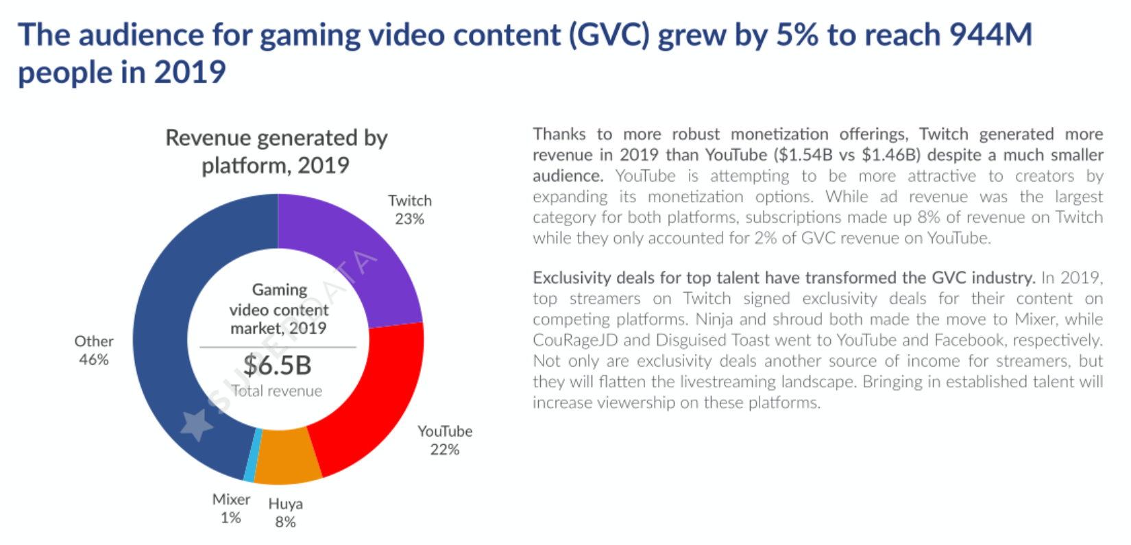 SuperData统计了各在线串流媒体和直播平台(例如Twitch、YouTube和虎牙)产生的收入金额,显示GVC整体产值在2019为65亿美元。