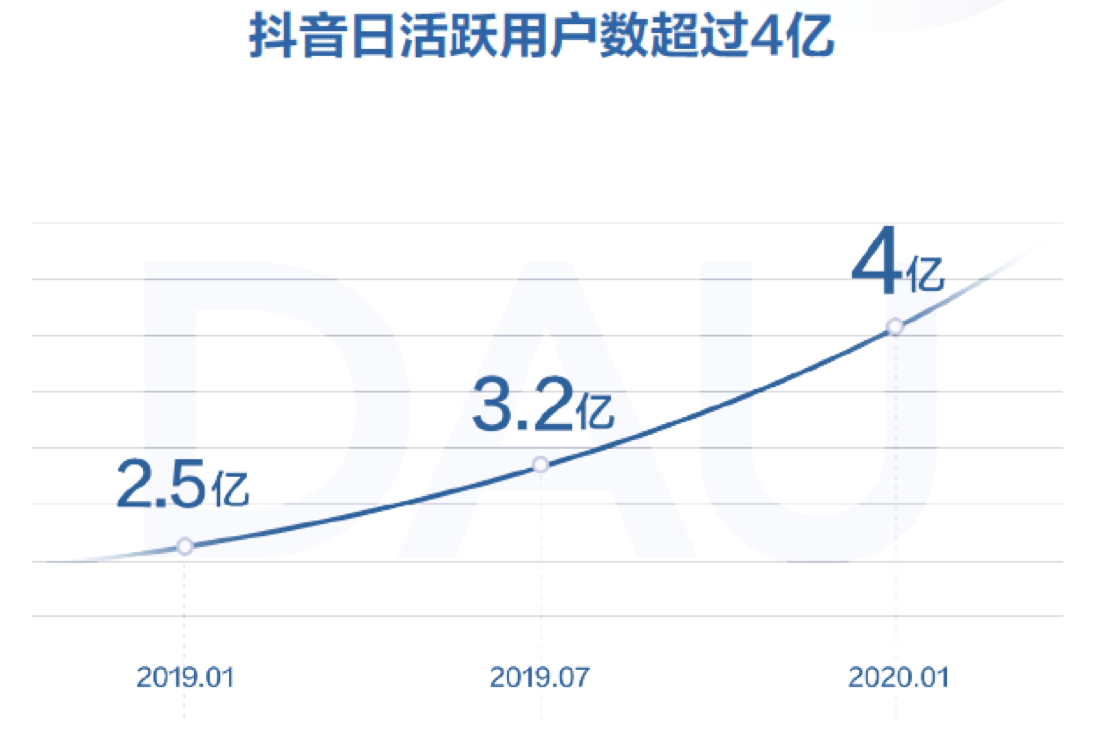 1月6日,抖音发布《2019抖音数据报告》。报告显示,截至2020年1月5日,抖音日活跃用户数已经突破4亿,继微信之后,抖音已成为移动互联网成长最快的产品。