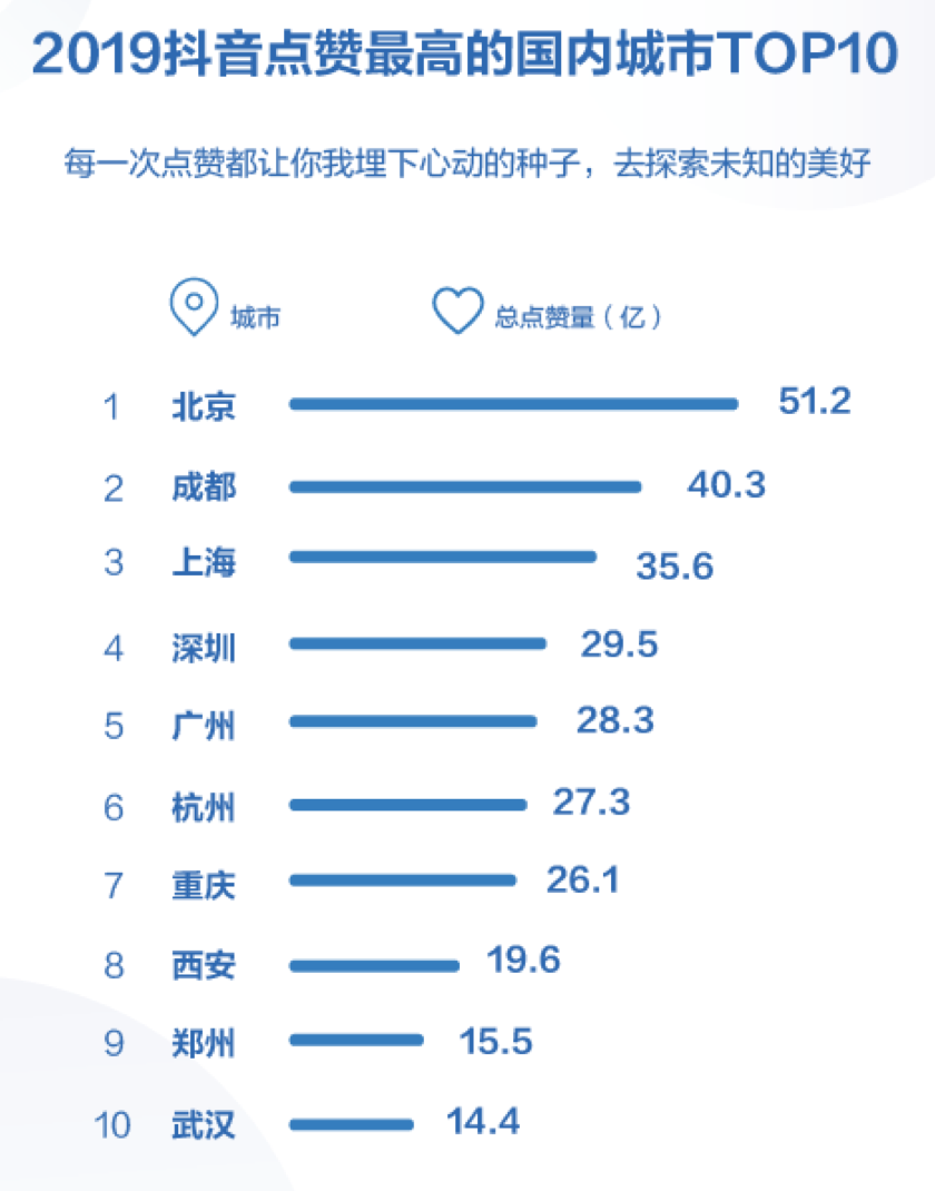 也有人习惯在抖音云游四海。2019年,抖音用户全球打卡6.6亿次,足迹遍及全世界233个国家和地区,最受欢迎的国外城市是曼谷、首尔和东京,被点赞最多的国内城市是北京、成都和上海。根据城市形象视频点赞量,北京是2019年度“抖音之城”,收获51.2亿次点赞。